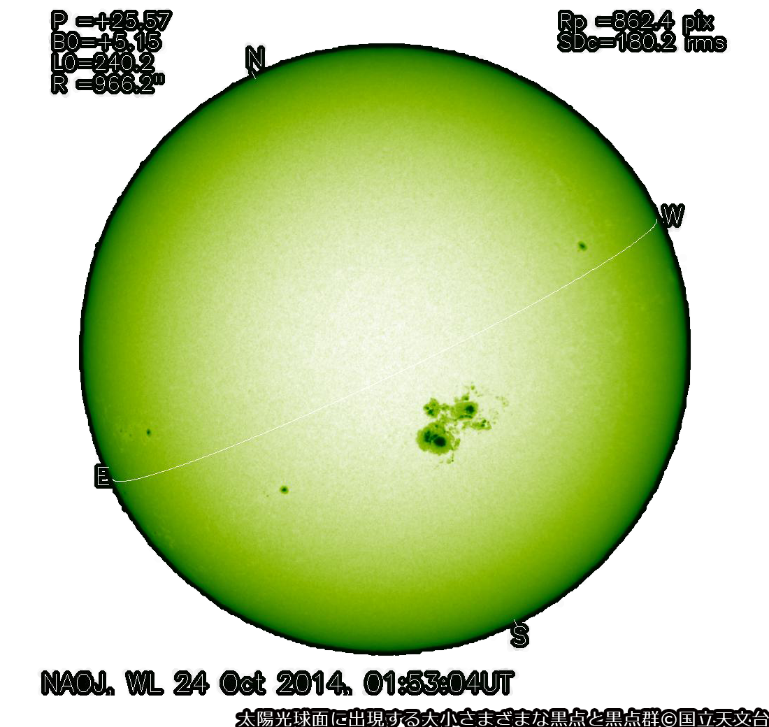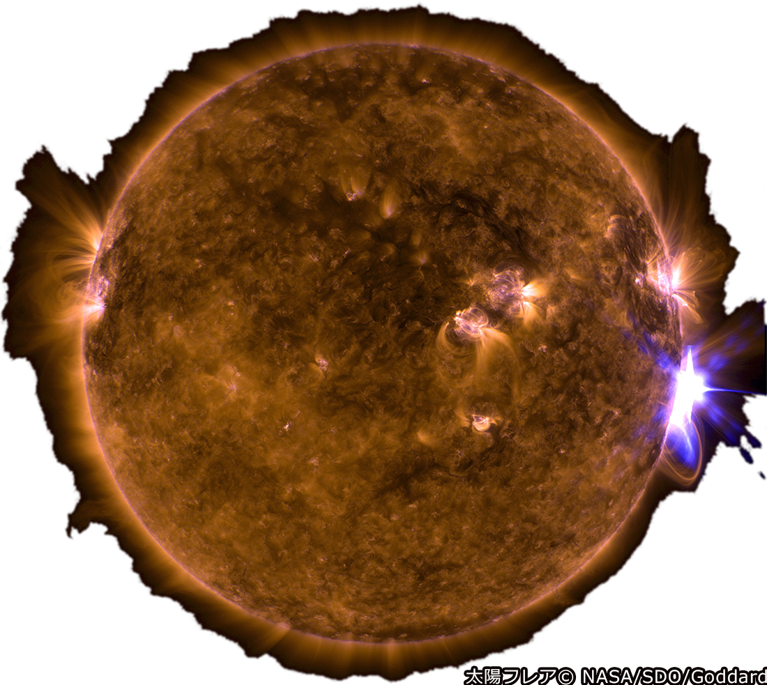 表面に見える「黒点(こくてん)」のまわりでは、強力な磁場が生じ「太陽フレア」と呼ばれる巨大な爆発現象を起こしています。外側には100万℃以上にもなる超高温のガス層「コロナ」があり、電気を帯びた小さな粒子(プラズマ)が吹き出しています。この粒子は「太陽風(たいようふう)」となって太陽系の端まで飛んでいきます。